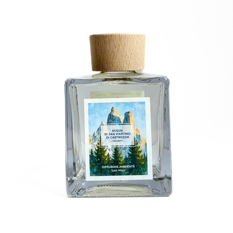 Inspired by Sass Maor, one of the most iconic peaks of the Pale di San Martino, this reed diffuser fills living spaces with a warm and enveloping fragrance, evoking the quiet strength of the mountains.
